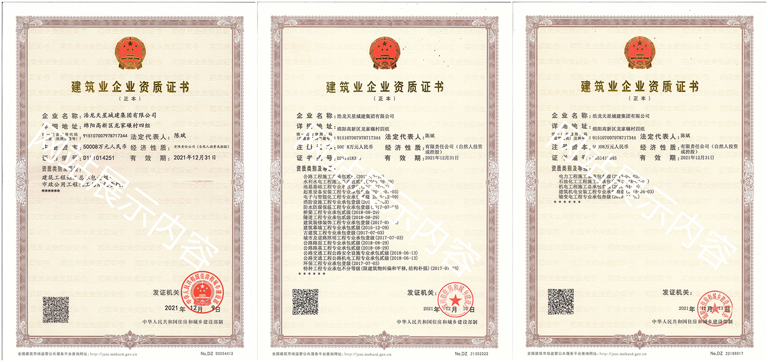 浩龍?zhí)煨浅墙瘓F(tuán)有限公司,2007年成立于“李白故鄉(xiāng)、中國科技城”—四川省綿陽市,企業(yè)注冊資本金5.0008億元。公司共有27項建筑業(yè)企業(yè)資質(zhì),其中國家一級資質(zhì)11項,二級資質(zhì)10項,三級資質(zhì)5項,特種資質(zhì)不分等級1項,類別涵蓋建筑、市政、水利、機(jī)電、隧道、起重設(shè)備安裝等基礎(chǔ)及未來發(fā)展重點專業(yè)。公司...